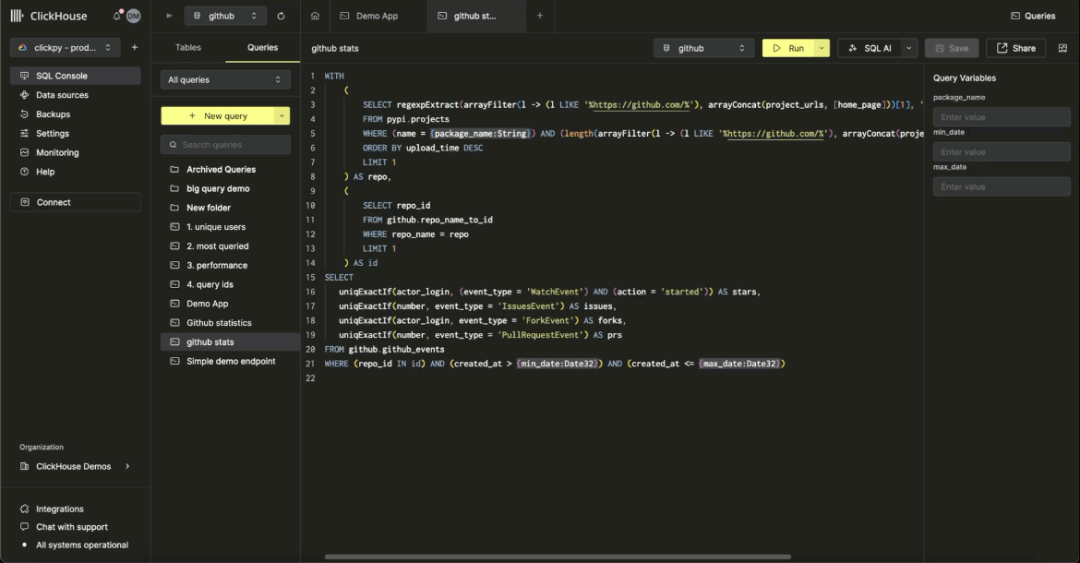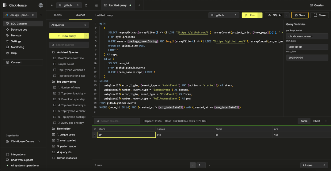 SET param_package_name='boto3'WITH(SELECT versionFROM pypi.projectsWHERE name = {package_name:String}ORDER BY arrayMap(x -> toUInt8OrDefault(x, 0), splitByChar('.', version)) DESCLIMIT 1) AS max_version,project_details AS (SELECTname,max_version,summary,author,author_email,license,home_page,trim(TRAILING '/' FROM regexpExtract(arrayFilter(l -> (l LIKE '%https://github.com/%'), arrayConcat(project_urls, [home_page]))[1], '.*https://github.com/(.*)')) AS githubFROM pypi.projectsWHERE (name = {package_name:String})ORDER BY upload_time DESCLIMIT 1),id AS (SELECT repo_idFROM github.repo_name_to_idWHERE repo_name IN (SELECT github FROM project_details) LIMIT 1),stats AS (SELECTuniqExactIf(actor_login, (event_type = 'WatchEvent') AND (action = 'started')) AS stars,uniqExactIf(number, event_type = 'IssuesEvent') AS issues,uniqExactIf(actor_login, event_type = 'ForkEvent') AS forks,uniqExactIf(number, event_type = 'PullRequestEvent') AS prsFROM github.github_events_v2WHERE (repo_id IN id))SELECT * FROM project_details, stats FORMAT VerticalRow 1:──────name: requestsmax_version: 2.32.3summary: Python HTTP for Humans.author: Kenneth Reitzauthor_email: me@kennethreitz.orglicense: Apache-2.0home_page: https://requests.readthedocs.iogithub: psf/requestsstars: 22032issues: 1733forks: 5150prs: 10261 row in set. Elapsed: 0.472 sec. Processed 195.71 million rows, 394.59 MB (414.49 million rows/s., 835.71 MB/s.)Peak memory usage: 723.12 MiB.
