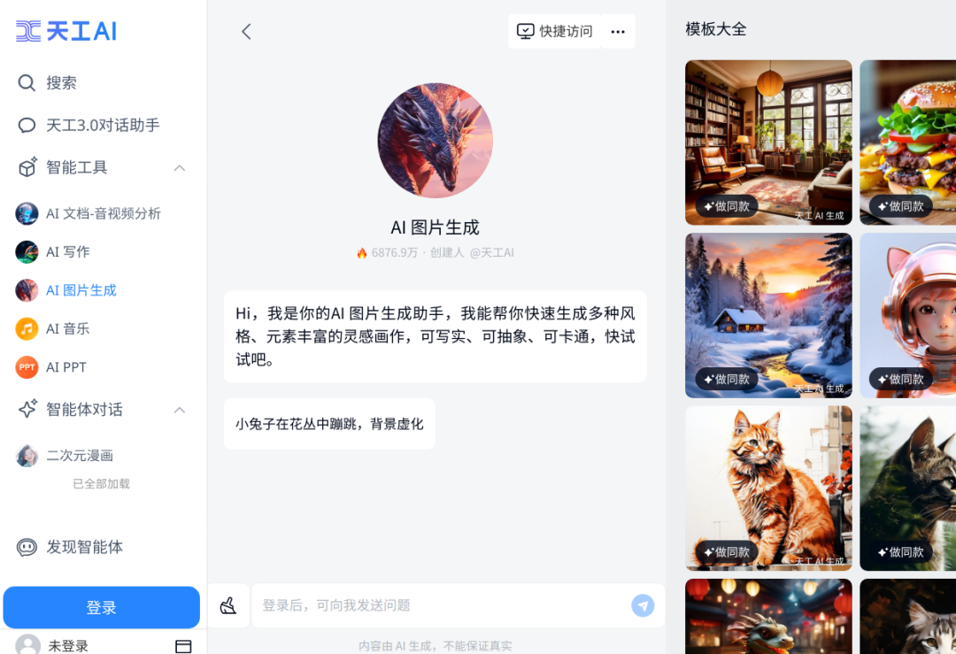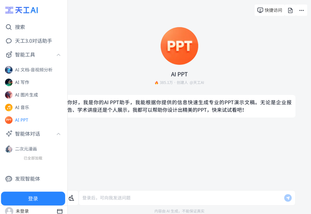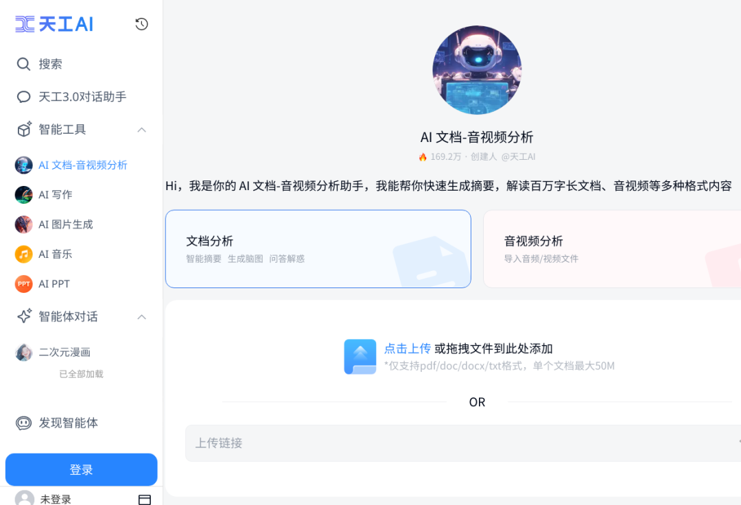 天工AI由昆仑万维基于自研“天工”大语言模型打造,是具备搜索、对话、协作、文档分析、画画、做PPT能力的全能AI助手。