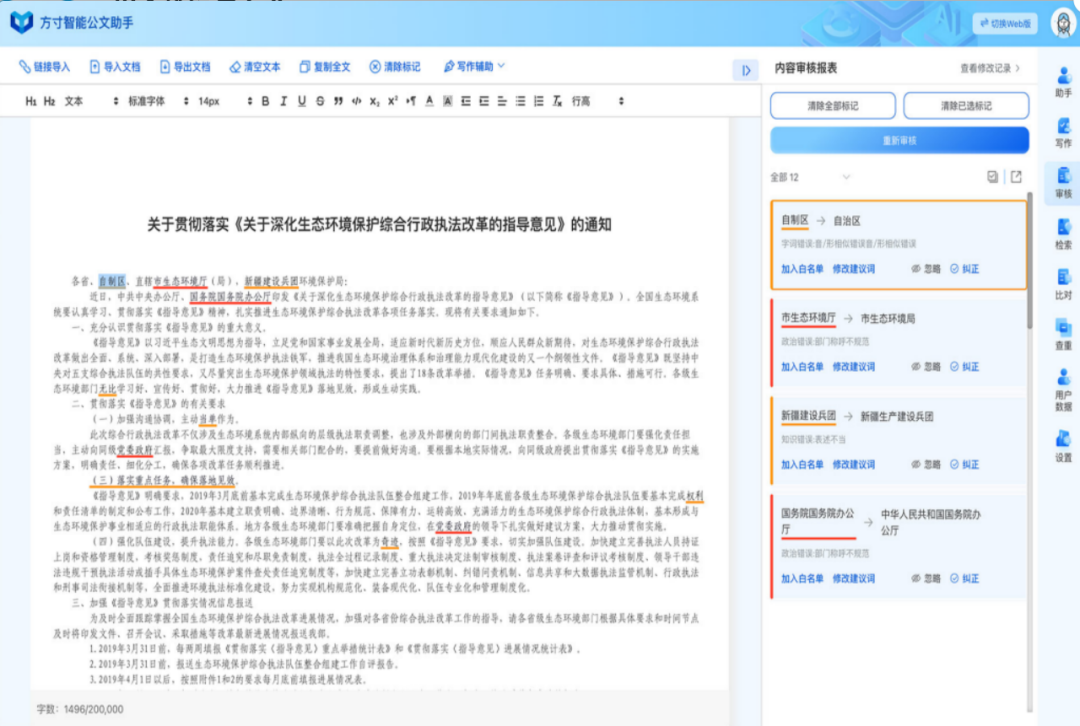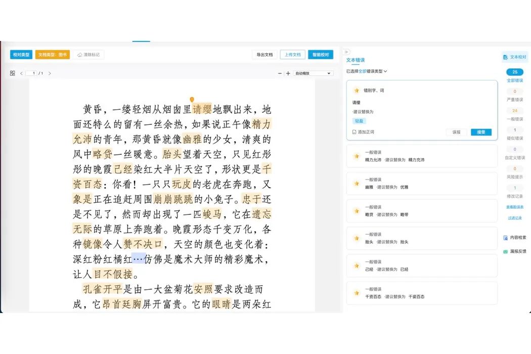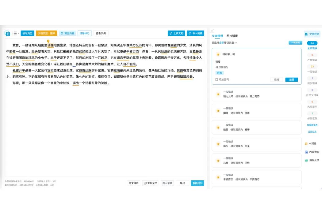 蜜度校对通是一款基于大模型技术的智能校对软件,具有35类审核功能,支持文字、图片、音视频等多种格式的内容检测与校对,适用于政府公文、新闻稿件、媒体出版等多个领域,有助于提高文本质量,减少错误。