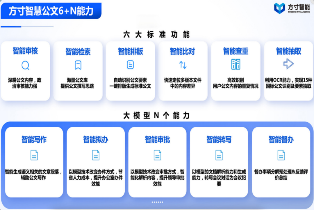 方寸智能AI无忧智慧公文大模型" 是一款适用于信创环境的浏览器端产品,支持语音识别、语义分析、OCR识别等技术,可自动起草和摘要公文,提供辅助材料,智能校对,旨在提升公文处理效率及辅助决策。