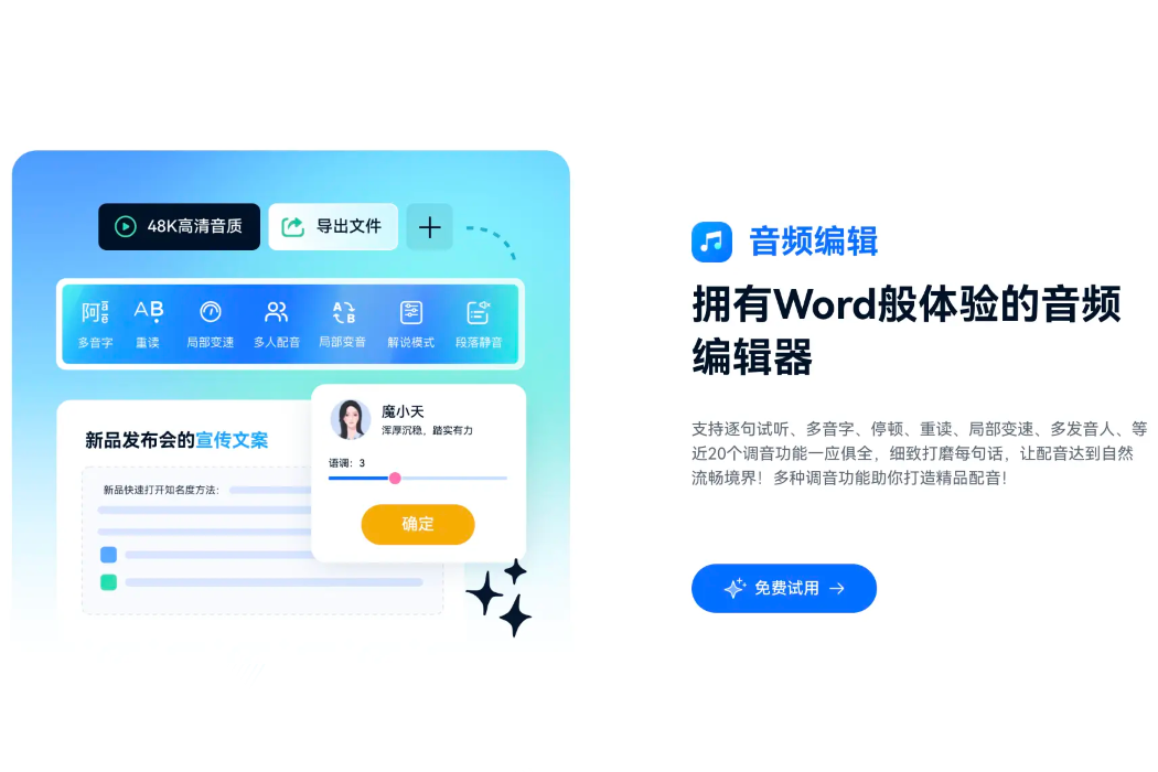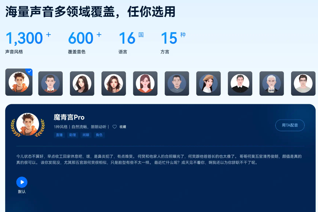 魔音工坊一款媲美真人的AI配音软件,广泛应用于视频配音、新闻播报、有声书、有声电台、外语出海等多种配音场景,拥有800多款声音、1000多种风格,简单易用、轻松上手。