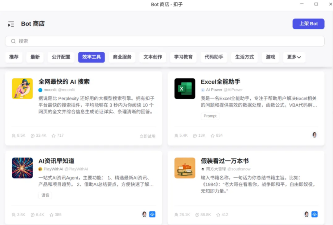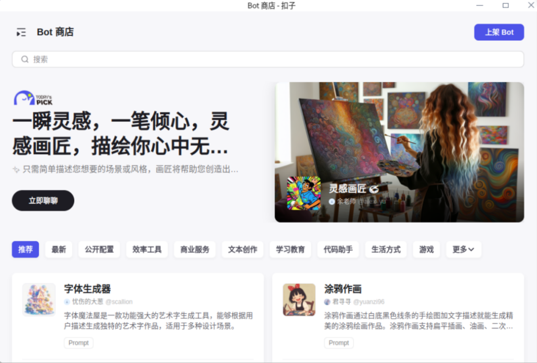 “扣子”是字节跳动推出的一个AI Bot应用开发平台。该平台允许用户在无需编写代码的情况下,迅速创建出自己的AI Bot,并提供了多种插件来满足不同需求,如新闻阅读、旅行规划等。