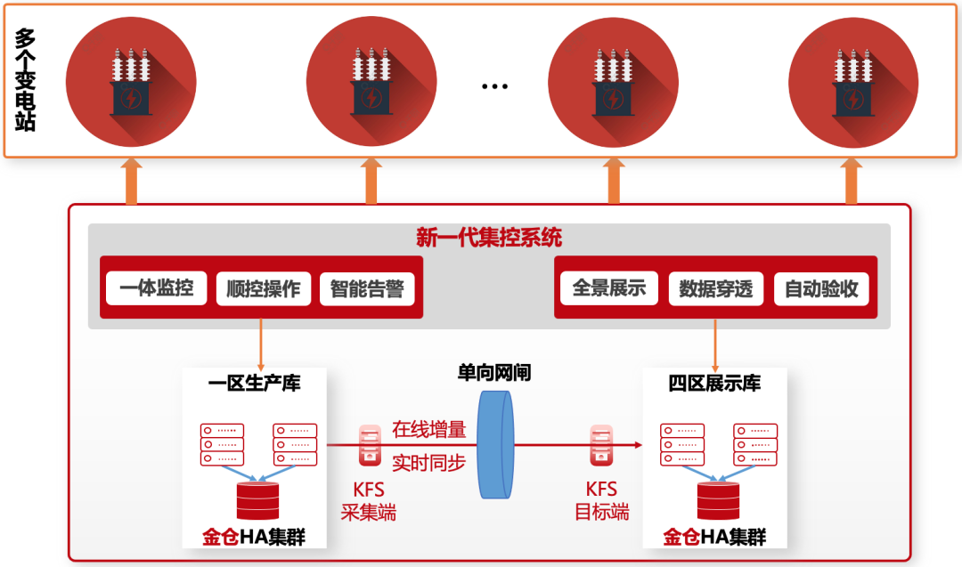 在新一代变电监控应用系统中,电科金仓提供了成熟的商业化数据库KES V8R6和在线增量实时同步产品KFS,这些产品经过20余年的产业化实践,在运营商、金融、能源、交通、公检法等50多个行业关键应用数字化升级项目中,经历了众多应用场景的工程化磨练、快速迭代和验证。基于KFS采集端多线程流水线作业、加载端并行分片入库创新技术,通过单向网闸,实现生产控制大区与管理信息大区的高效、可靠数据互通。