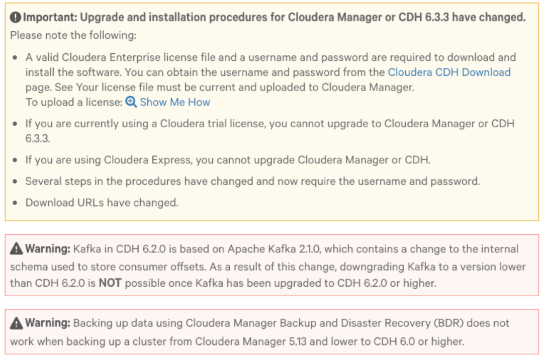 Cloudera Manager 将集群配置为指定的 CDH 版本,但不执行升级或服务重启。手动升级比较困难,并且仅适用于高级用户。手动升级可以有选择地停止和重新启动服务,以防止或减轻不支持滚动重启的服务或集群的停机时间。