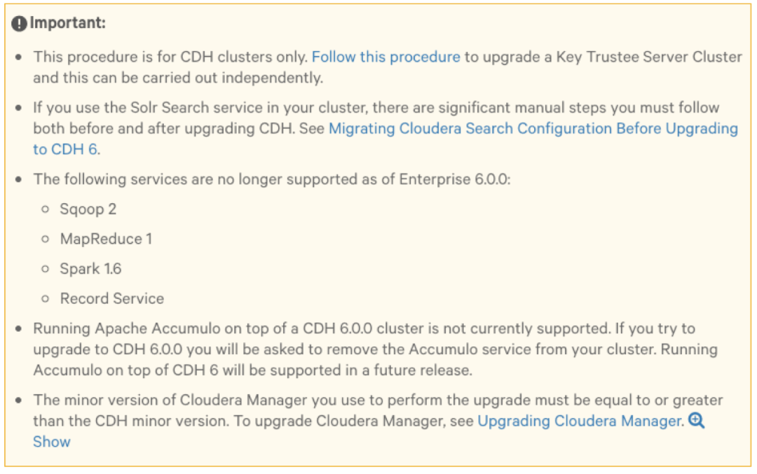 CDH 6.0.0 集群上运行 Apache Accumulo 目前不支持。如果升级到 CDH 6.0.0,则要求移除 Accumulo service。但是在 CDH 6 上运行 Accumulo 在以后的版本中会支持。