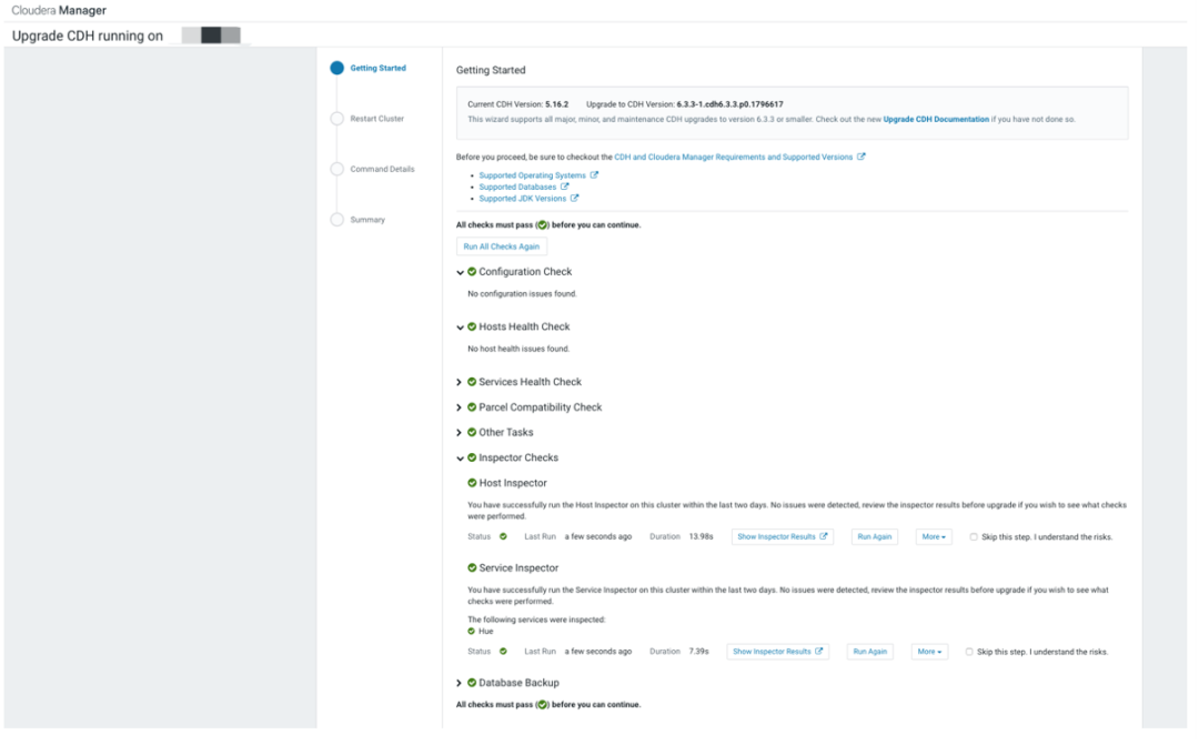 如果任何步骤失败,请更正所有报告的错误,然后单击 Resume 按钮。Cloudera Manager 将跳过已成功重启的角色。或者,返回 Home > Status 选项卡,然后执行 Upgrading CDH Manually after an Upgrade Failure 中的步骤,进行手动升级。