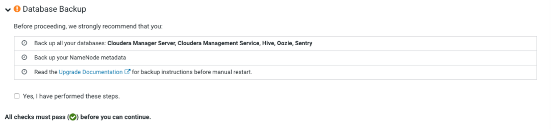 对前面升级过的 Cloudera Manager 再次进行备份。针对 Sentry, Cloudera Search(未部署), Apache Spark, HBase, Hue, Key Trustee KMS(未部署), HSM KMS(未部署)组件进行升级前操作(见下面)