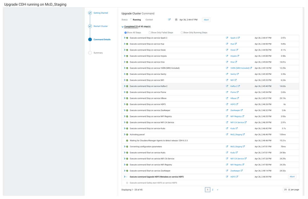 Upgrade Cluster Command 屏幕显示向导在关闭所有服务、激活新的 parcels、升级服务、部署客户端配置文件以及对支持该服务的服务进行滚动重新启动时运行的命令的结果。