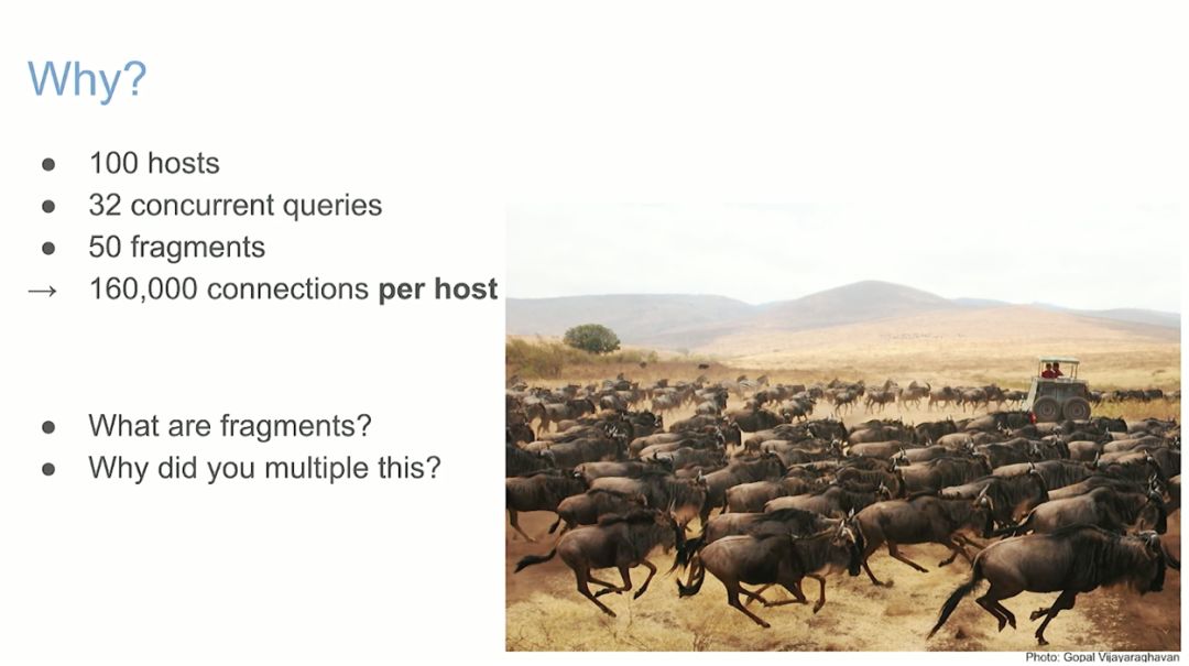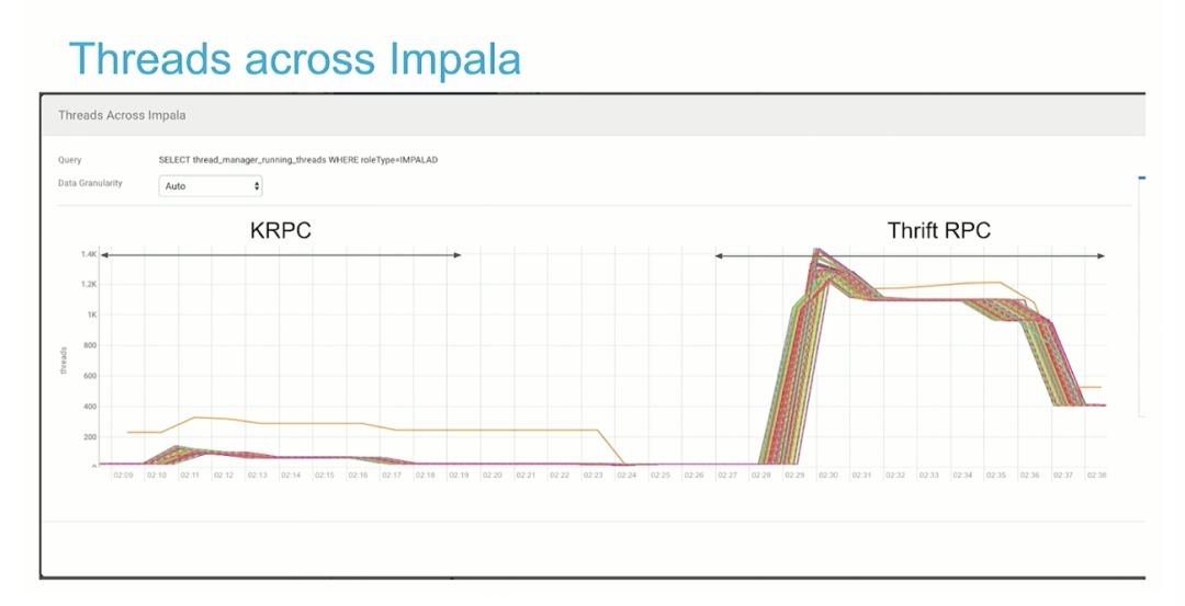 回到了笔者前面提到的问题,对于具有 32 个并发查询的 100 个节点的 Impala 集群,每个查询有 50 个片段,这将导致每个节点有 100 x 32 x 50 = 160,000 个连接和线程。而在整个集群中,将有 1600 万个连接。