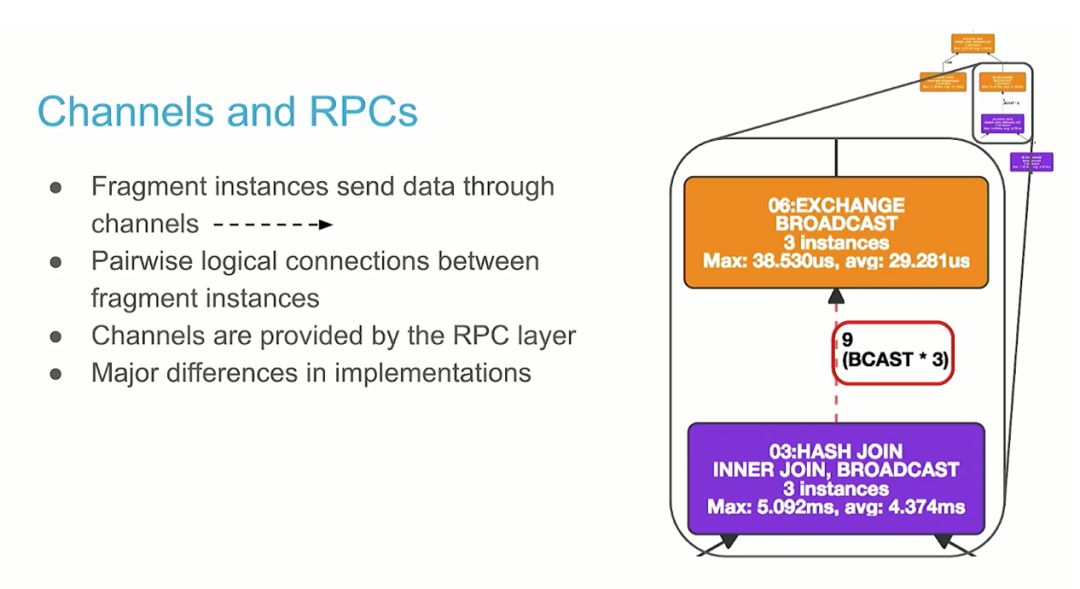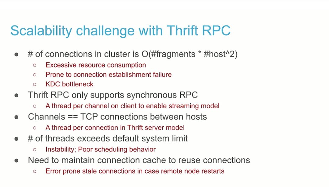 此外,每个 RPC 线程都必须打开并维护自己的连接。没有任何机制可以支持通过单个连接在两台计算机之间并行处理并行请求,这意味着每个查询的每个片段都必须维护与集群中所有其他主机的连接。为了避免创建过多的连接,Impalad 实施了连接缓存来回收网络连接。但是,连接缓存无法很好地处理失效的连接,这会导致意外的查询失败,甚至导致错误的结果。