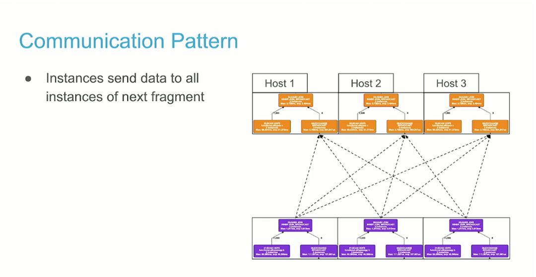 每一个 Fragment 的执行输出通过 DataStreamSink 发送到下一个 Fragment,由下一个 Fragment 的 ExchangeNode 接收,Fragment 运行的过程中不断的向 Coordinator 节点汇报当前的运行状态。