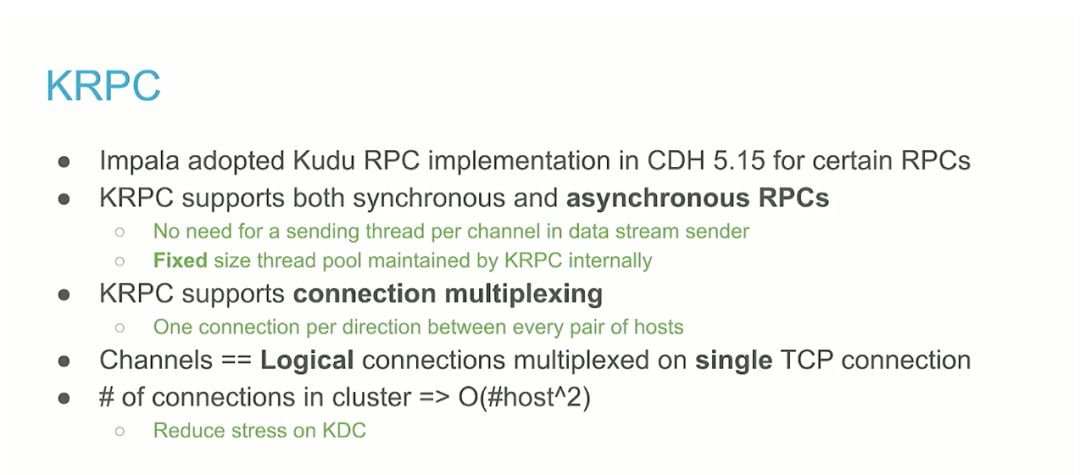 Kudu RPC (KRPC) 支持异步 RPC,这样每个连接就不需要一个线程。主机之间的连接是长期的。两个主机之间的所有 RPC 在同一个已建立的连接上进行多路复用,这大大减少了主机之间的 TCP 连接数量,并将连接数量与查询片段的数量解耦。