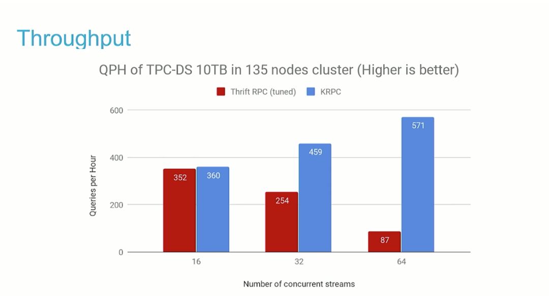 如上图所示,使用 KRPC 时,32 个并发的 TPC-DS 查询流显示出 2 倍的吞吐量。对于 64 个并发流,KRPC 提升效果甚至更为显着(6倍多)。