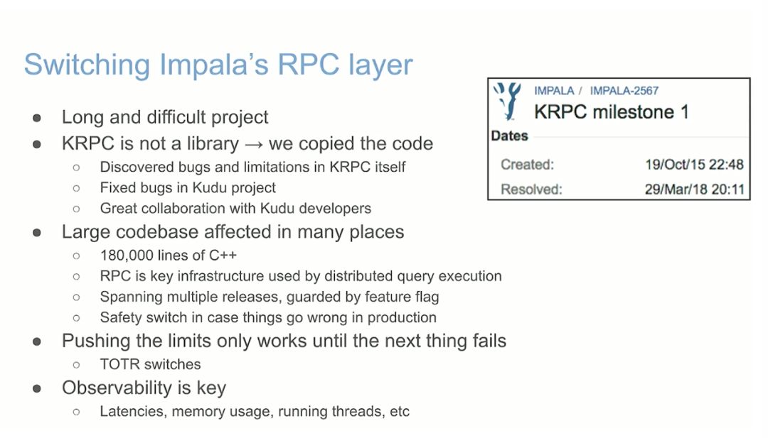 在社区的不懈努力下,Apache Kudu 的 RPC 框架(KRPC)已经成功地集成到 Impala 中。其实 KRPC 最初是为 Kudu 项目开发的,它从头开始构建,以支持跨多路连接的大量节点之间的异步通信,它还支持 TLS 和 Kerberos。