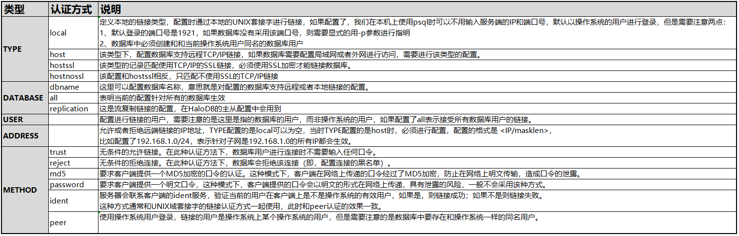 其中,在pg_hba.conf中,每一行代表一个完整的配置链路,每行都包含4-5个字段,每个字段的含义如下,我用一张图表来说明: