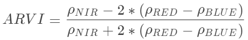 ARVI是NDVI的改进,它使用蓝色波段矫正大气散射的影响(如气溶胶),ARVI常用于大气气溶胶浓度很高的区域,如烟尘污染的热带地区或原始刀耕火种地区。其计算公式为:
