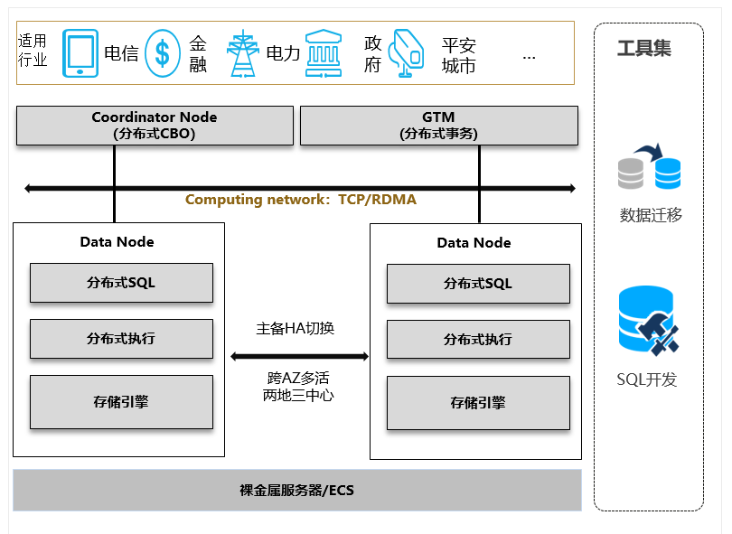 中兴GoldenDB是自主研发的分布式数据库系统,整体由计算节点、数据节点、全局事务管理器、管理节点四种核心模块组成,外围包含导入导出模块,以及相关的备份、恢复等运维工具。整个系统采用高可靠性设计无单点故障,计算节点为无状态多节点部署,数据集群内由多个安全分片组构成,每个安全分片组内数据节点主备多机部署,全局事务管理器主备多机部署。支持多集群及动态扩容,每个集群由多个安全分片组组成,每个安全分片组内部包含主备复制关系的数据库节点,可动态对集群内的安全分片组数量进行扩容以及动态增加集群的数量。通过全局事务管理器支持多节点的分布式事务,保证数据一致性。兼容SQL92、SQL99、SQL2003标准语法,完全兼容MySQL语法,兼容常用Oracle、DB2语法。GoldenDB 成功通过金融、运营商行业现网多年严苛考验,服务超百家重点行业用户,引领各行业核心业务数据库分布式架构转型;在行业主管部门的指导下引领标准制定,与行业伙伴共建新生态。