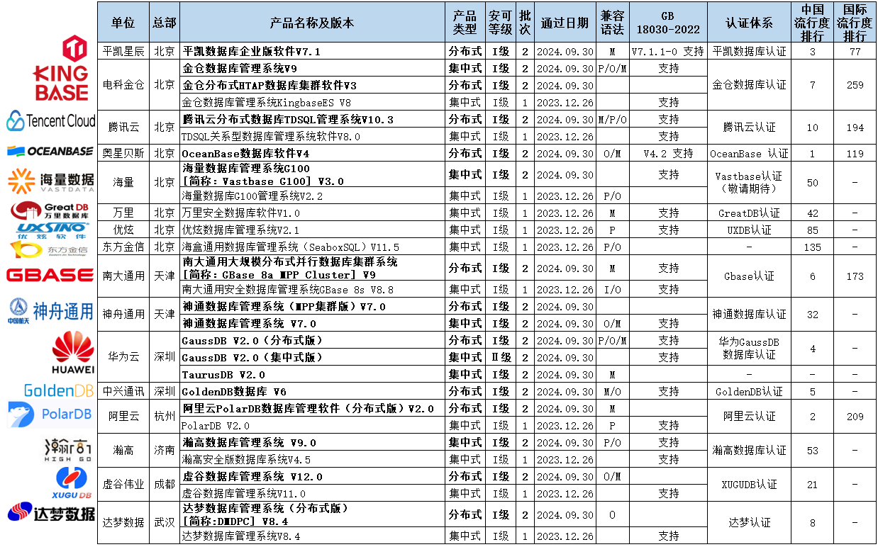 本次测评,共有6款集中式数据库和11款分布式数据库产品通过评审。2023年12月,第一份数据库产品测评,共有11款集中式数据库产品通过评审。合并统计两次评审结果数据,具体如下表所示。