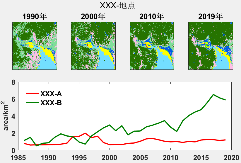 subplot(2,4,[5,6,7,8]) %面积的子图,其实是一共是2行4列,第一行的4列画tif,第二行的4个子图变成一个画面积趋势