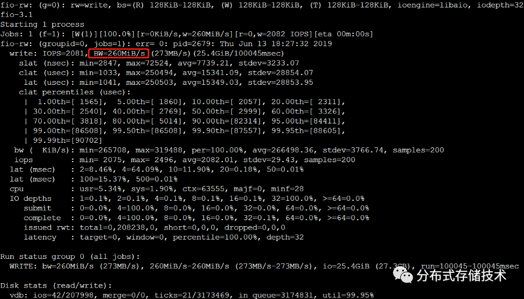 $ fio --bs=4m --ioengine=libaio --iodepth=128 --direct=1 --rw=write --time_based --runtime=300 --refill_buffers --norandommap --randrepeat=0 --group_reporting --name=fio-write --size=1G --filename=/dev/vdb