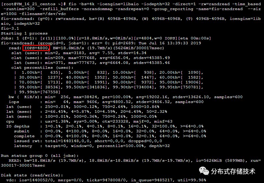 fio --bs=4k --ioengine=libaio --iodepth=1 --direct=1 --rw=randrw --time_based --runtime=100 --refill_buffers --norandommap --randrepeat=0 --group_reporting --name=fio-read --size=1G --filename=/dev/vdb