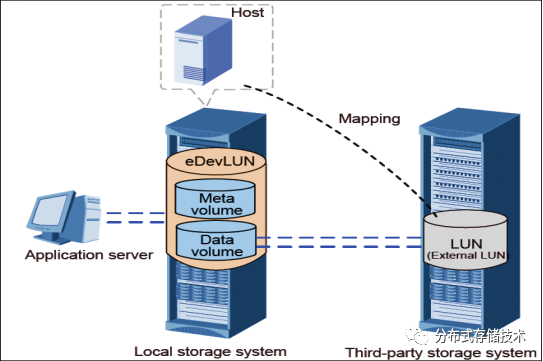 在本端存储系统的存储池中,本端存储系统会按虚拟化数据组织形式将映射的外部LUN创建为裸存储设备。通过这种方式创建的裸存储设备称为eDevLUN。eDevLUN包括元数据卷和数据卷,但eDevLUN在本端存储系统中占用的实际物理空间仅为元数据卷所需的存储空间。应用服务器可以通过eDevLUN访问外部LUN上的数据,并在eDevLUN上配置增值业务(例如,快照、远程复制、SmartMigration和卷镜像)。