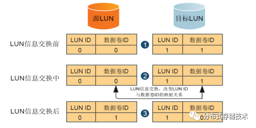 l 存储系统中,每个LUN和对应的数据卷都有属于自己的唯一标识,分别为LUN ID和数据卷ID。其中,源LUN是逻辑上的概念,源数据卷是物理上的概念,两者之间形成一一对应的映射关系。LUN信息交换主要是针对LUN和数据卷之间的映射关系,即源LUN和目标LUN的LUN ID保持不变的情况下,将源数据卷和目标数据卷的数据卷ID相互交换。