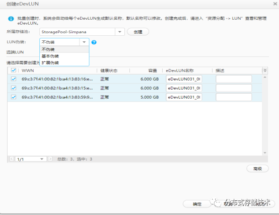 在目标存储创建与eDevLUN相同的lun,需归属于同一个控制器(这里创建3个)