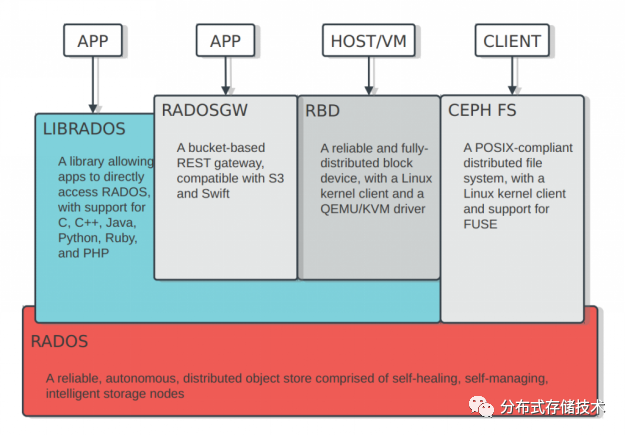 Ceph的底层是RADOS,它的意思是“A reliable, autonomous, distributed object storage”。RADOS由两个组件组成: