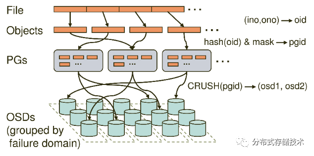 在Ceph中,Object先映射到PG(Placement Group),再由PG映射到OSD set。每个Pool有多个PG,每个Object通过计算hash值并取模得到它所对应的PG。PG再映射到一组OSD(OSD的个数由Pool 的副本数决定),第一个OSD是Primary,剩下的都是Replicas。