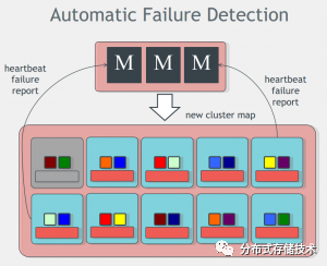 OSD之间有心跳检测,当OSD A检测到OSD B没有回应时,会报告给Monitors说OSD B无法连接,则Monitors给OSD B标记为down状态,并更新OSD Map。当过了M秒之后还是无法连接到OSD B,则Monitors给OSD B标记为out状态(表明OSD B不能工作),并更新OSD Map。