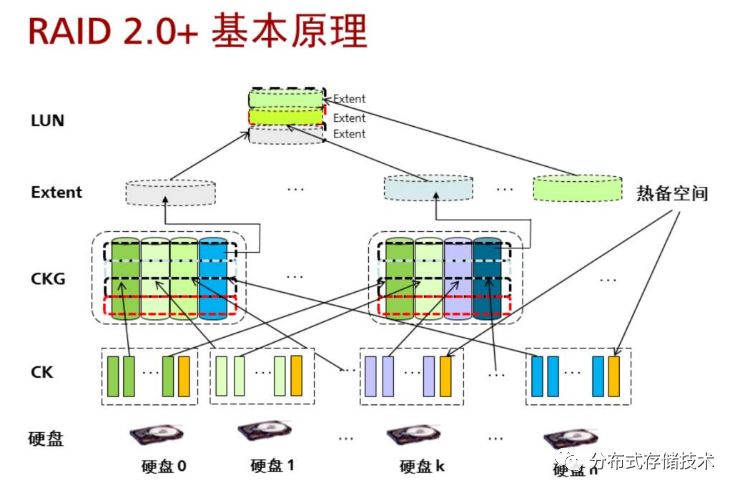 raid2.0 实现了块级虚拟化,成员以CK为单位组建raid组,重构速度块,实现了负载均衡,不存在单独的热备盘,以热备空间的形式,每一个盘都可以作为业务盘与热备盘实现负载均衡;但是盘少的时候用raid 2.0反而没有raid 1.0来的好,因为盘越多raid 2.0的性能提升明显,盘少的时,raid 2.0性能提升不多,但是元数据管理开销更大。