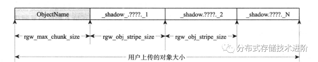 如上图,rgw_max_chunk_size和rgw_obj_stripe_size默认都是4M。用户上传对象到RGW网关服务后,会先分割成一个4M的首对象,和多个大小为4M的中间对象,以及最后一个尾对象(小于或者等于4M)。首对象就是我们常说的head_obj, 它就是以对象本来的名字命名的。其他中间对象和尾对象的名字都是按 _shadow + . +32bit随机字符串+条带编号,这样的规则进行命名的。