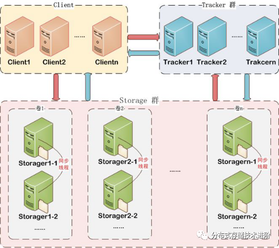 storage server:存储服务器(又称:存储节点或数据服务器),以组(卷,group或volume)为单位组织,一个group内包含多台storage机器,数据互为备份。文件和文件属性(meta data)都保存到存储服务器上。Storage server直接利用OS的文件系统调用管理文件。