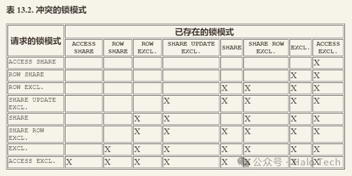 下表13.2冲突的锁模式