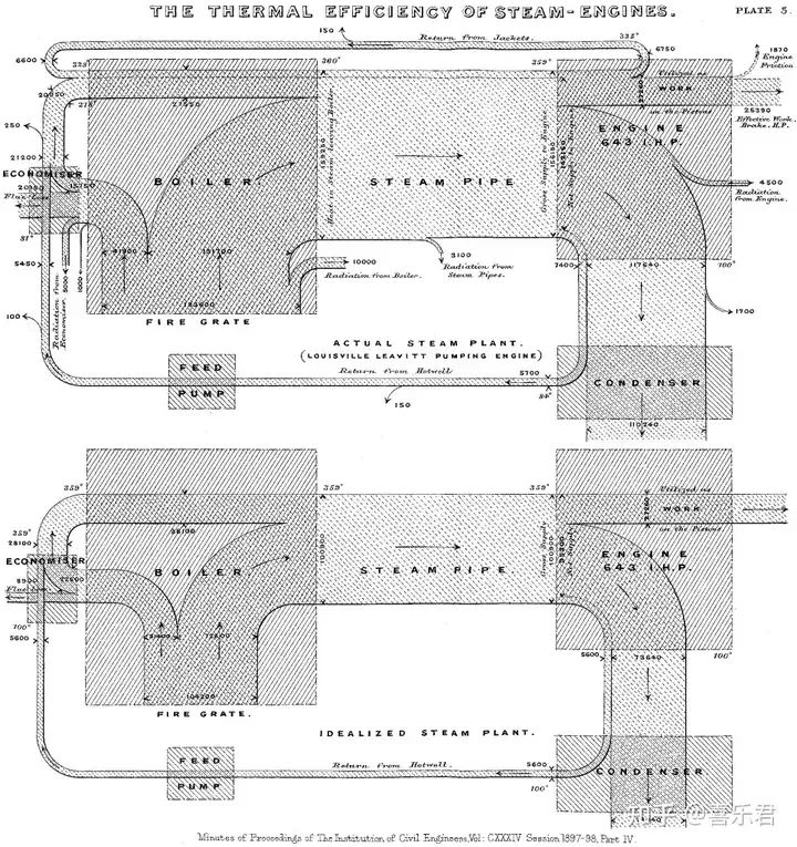 桑基图最初是用来描述蒸汽机(steam engine)的热量流转效率(energy flow efficiency),下图来自于1898年的Sankey图示,相对而言形式更加严谨复杂,