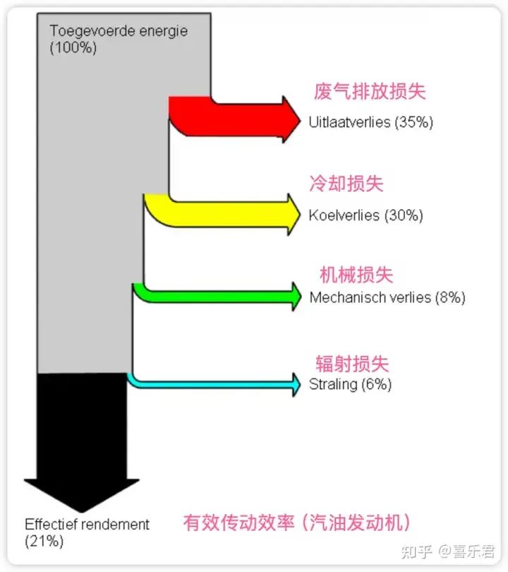 在这里,连续性的度量是"热量",离散的输入和输出代表维度分类。如右侧所示,内燃机能量的取向,除了正常的做功驱动机器运转,相当多的能力被浪费掉了,包含驱动损失、齿轮等磨损损失、热流失等等。