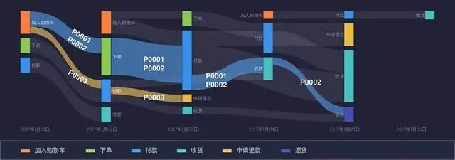 桑基图必须要有两个或以上的维度分类,两个维度分类有必然的先后次序,分别表示流向的起点、终点。