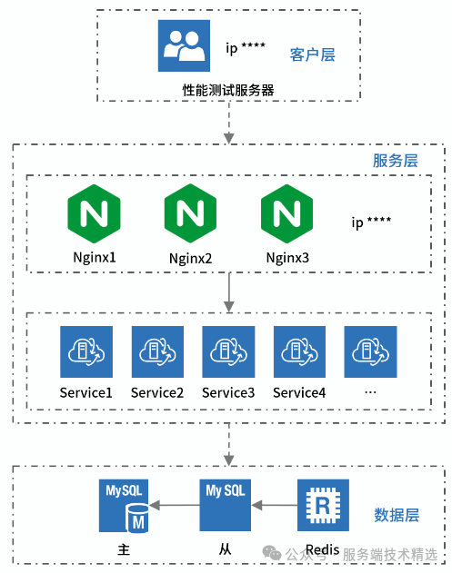 被测的业务部署架构是什么意思呢,简单来说就是被测服务涉及哪些组件,每个组件部署在哪些服务器上,服务器的配置是怎样的。需要画一个部署架构示意图,有了这张图,才能知道如何做到全貌监控,以及遇到问题从哪些服务入手。