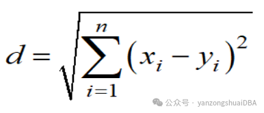其中,n表示他是n维向量,上图表示两个向量在第i维度上的分量差平方和,然后在开方就是两个向量的欧式距离。