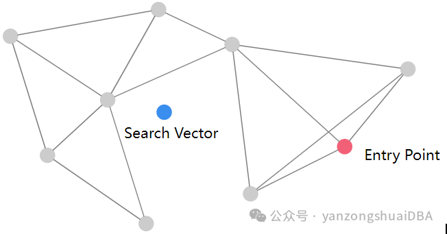 1)在下图二维空间上构建一个NSW索引,该层有一个entry点,找一个最近邻,下图中的红色点。需要找到search向量(蓝色点)的最近邻