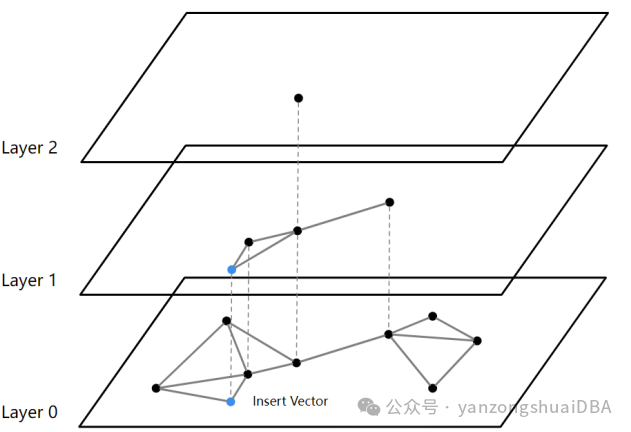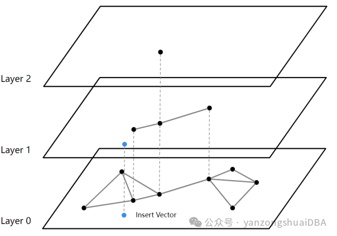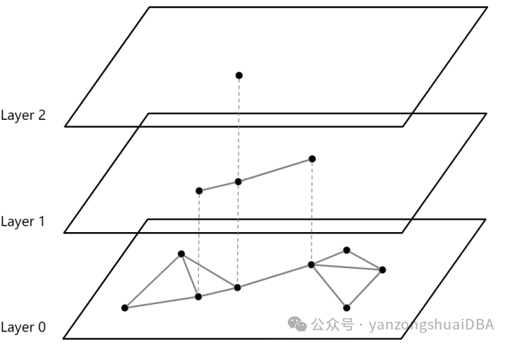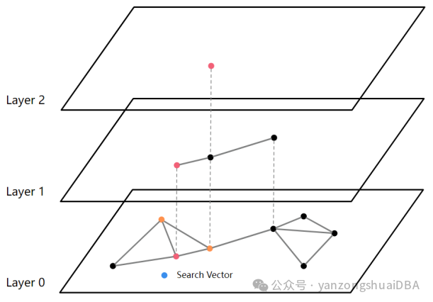 HNSW在NSW索引上添加了分层架构,可以让检索更快。这个idead和调表结构类似,底层即0层的NSW包含所有信息。随机选一些向量放到上层(越上层向量越少,并且也是NSW索引),搜索从最上层开始,使用该层的最近邻作为下层的entry点: