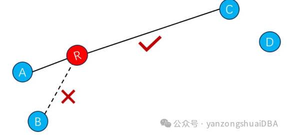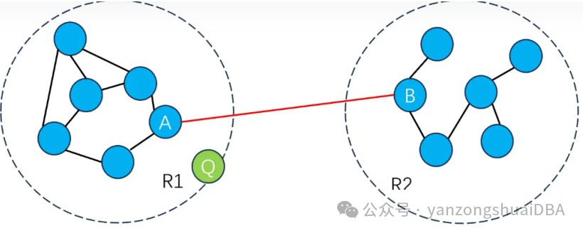 当然,这里会有一个问题,如下图所示:每层中的度是有阈值的,若超过就需要进行裁剪;在插入Q之前A和B之间有连接,插入Q后若A的度超过了,进行裁剪时需要裁剪掉A和B之间的线,那么R1和R2的范围就产生了孤岛,如果entry点在R2,查询节点在R1,就永远找不到合适的结果。HNSW为解决这个问题,设计了新的搜索算法,假设被重构点的top k近邻全部挤在一起,就舍弃其中几个,选择保留相对较远的其他近邻。