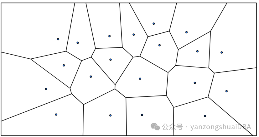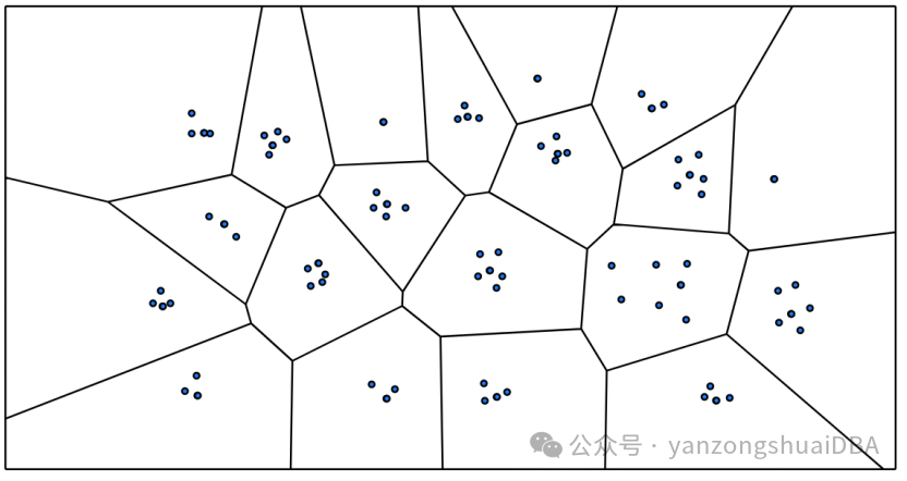 2)可以使用K-means算法找到上面向量的质心(聚类概念),每个质心对应一个桶,每个桶存储一簇向量。到两个质心欧式距离相等的点构成边,表示每个桶的分隔线: