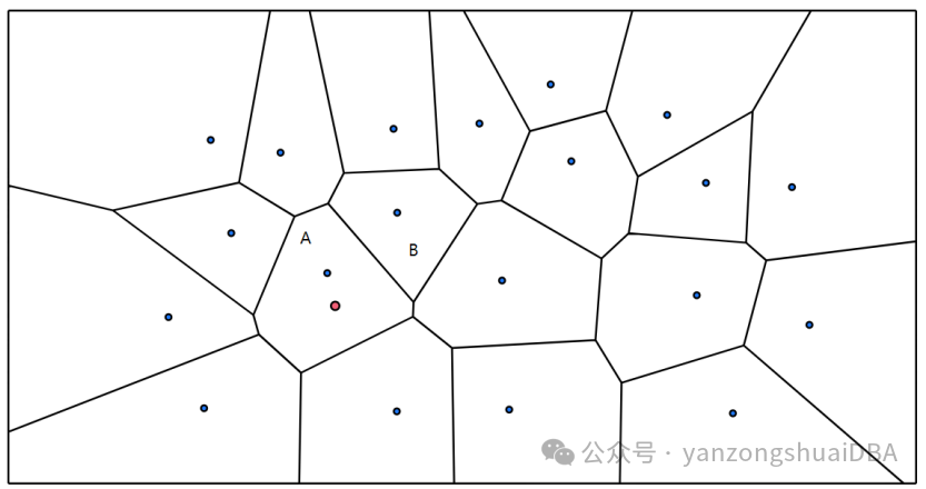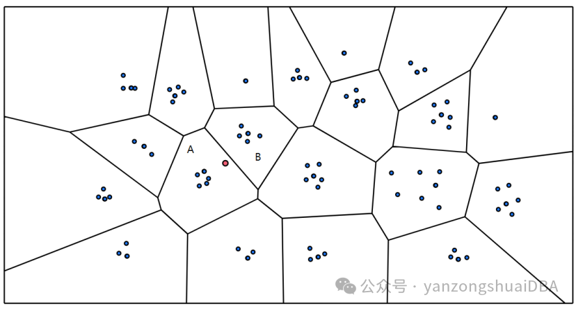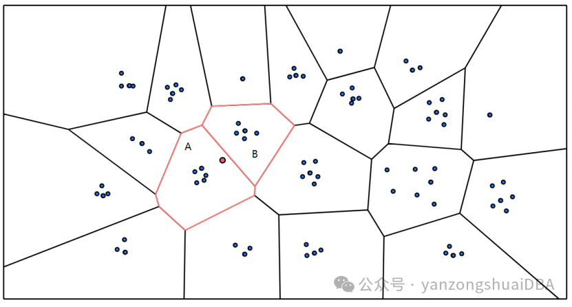 以下图为例,红色顶点是用户想要查找的基准向量,他有5个最近邻。如果我们近从A桶中查找(红色顶点所在桶),会找到桶A的5个顶点。然而,有可能在A桶的邻居B桶中存在到基准探测向量更近的点。因此,为了提高查找的准确性,最好探查多个桶以得到更近准确的最近邻。