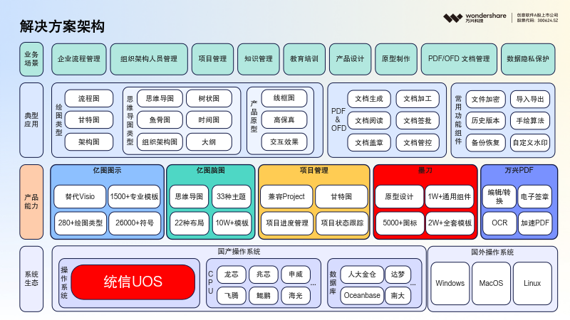 办公绘图+版式文档+国产化环境的整体解决方案,以满足客户在电子公文处理和数据可视化方面的需求。方案中包含了亿图图示、亿图脑图、墨刀、万兴PDF等多款产品与统信UOS组合成的软件生态环境,为客户提供高效的、全方位的办公体验,助力其降本增效,实现数字化转型和信息化升级。