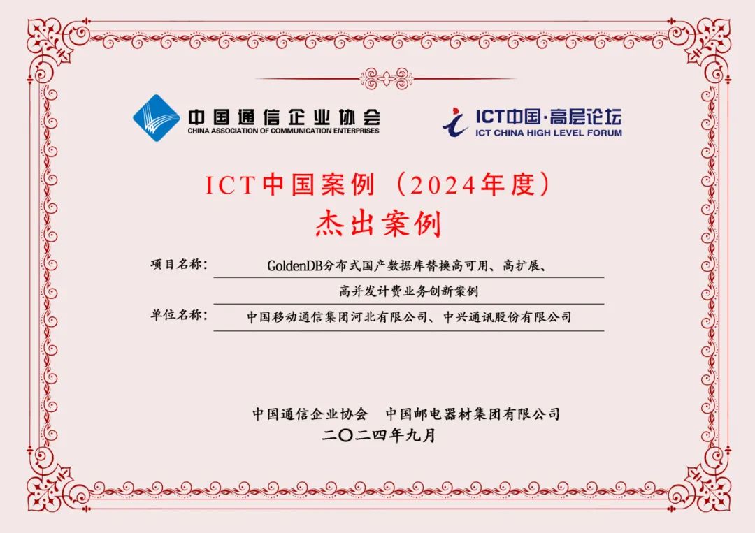 9月25日下午北京PT展期间,ICT中国·高层论坛主论坛公布了ICT 中国(2024)案例入选结果,四川移动、河北移动和山东移动与金篆GoldenDB联合申报的方案均成功入选。河北移动与金篆GoldenDB联合申报的《GoldenDB分布式国产数据库替换高可用、高扩展、高并发计费业务创新案例》获评杰出案例。