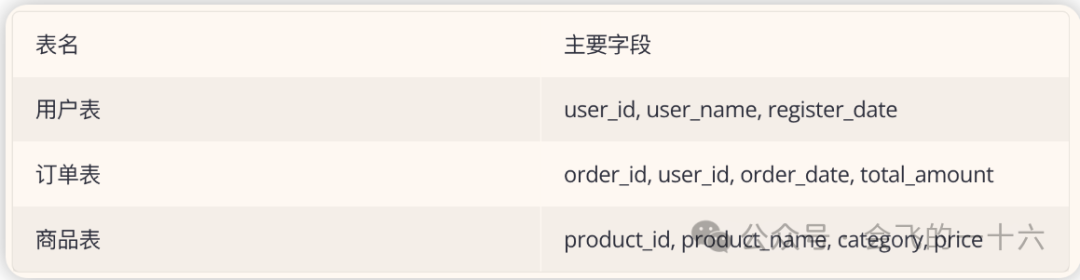 -- 用户表CREATE TABLE users (user_id INT PRIMARY KEY,user_name VARCHAR(50),register_date DATE,last_login DATE);-- 订单表CREATE TABLE orders (order_id INT PRIMARY KEY,user_id INT,order_date DATE,total_amount DECIMAL(10, 2),FOREIGN KEY (user_id) REFERENCES users(user_id));-- 商品表CREATE TABLE products (product_id INT PRIMARY KEY,product_name VARCHAR(100),category VARCHAR(50),price DECIMAL(10, 2));