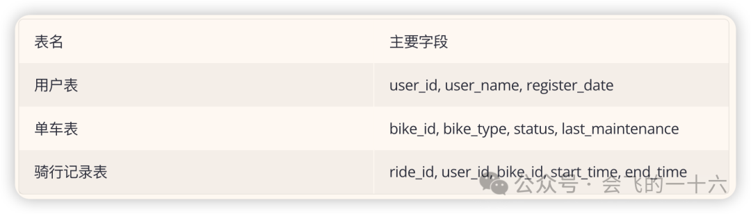 -- 用户表CREATE TABLE users (user_id INT PRIMARY KEY,user_name VARCHAR(50),register_date DATE,last_login DATE);-- 单车表CREATE TABLE bikes (bike_id INT PRIMARY KEY,bike_type VARCHAR(20),status VARCHAR(10),last_maintenance DATE);-- 骑行记录表CREATE TABLE rides (ride_id INT PRIMARY KEY,user_id INT,bike_id INT,start_time TIMESTAMP,end_time TIMESTAMP,start_location VARCHAR(100),end_location VARCHAR(100),FOREIGN KEY (user_id) REFERENCES users(user_id),FOREIGN KEY (bike_id) REFERENCES bikes(bike_id));