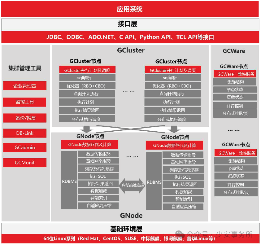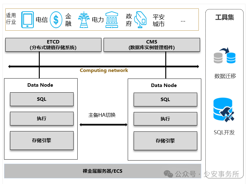 中兴GoldenDB是自主研发的分布式数据库系统,整体由计算节点、数据节点、全局事务管理器、管理节点四种核心模块组成,外围包含导入导出模块,以及相关的备份、恢复等运维工具。整个系统采用高可靠性设计无单点故障,计算节点为无状态多节点部署,数据集群内由多个安全分片组构成,每个安全分片组内数据节点主备多机部署,全局事务管理器主备多机部署。支持多集群及动态扩容,每个集群由多个安全分片组组成,每个安全分片组内部包含主备复制关系的数据库节点,可动态对集群内的安全分片组数量进行扩容以及动态增加集群的数量。通过全局事务管理器支持多节点的分布式事务,保证数据一致性。兼容SQL92、SQL99、SQL2003标准语法,完全兼容MySQL语法,兼容常用Oracle、DB2语法。GoldenDB 成功通过金融、运营商行业现网多年严苛考验,服务超百家重点行业用户,引领各行业核心业务数据库分布式架构转型;在行业主管部门的指导下引领标准制定,与行业伙伴共建新生态。